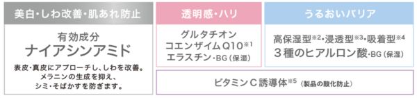 *年齢に応じたケア ※1 ユビデカレノン ※2 アセチル化ヒアルロン酸ナトリウム ※3 加水分解ヒアルロン酸/浸透は角層まで ※4 ヒアルロン酸ヒドロキシプロピルトリモニウム ※5 リン酸-アスコルビルマグネシウム BGは1,3-ブチレングリコールです。