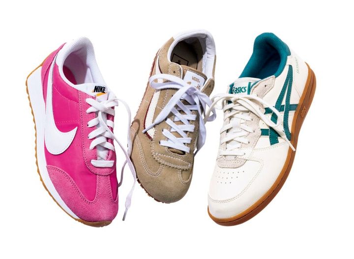 右から、グリーン×白、ガムソールのすっきりしたバランスが大人にちょうどいい。90年代のハンドボールシューズがベース。¥12,100(アシックス/アシックスジャパン カスタマーサポート部) ベージュのスウェードアッパーと配色ラインが大人っぽい。細身のフォルムで合わせやすい。¥11,000(ヴァンズ/ヴァンズ ジャパン カスタマーサポート) 旬のポップな気分を手軽に纏えるピンク。¥9,130(ナイキ スポーツウェア/ナイキ カスタマーサービス)