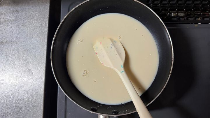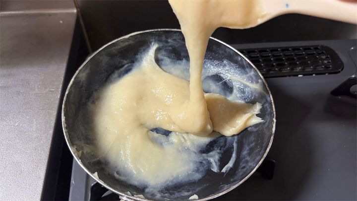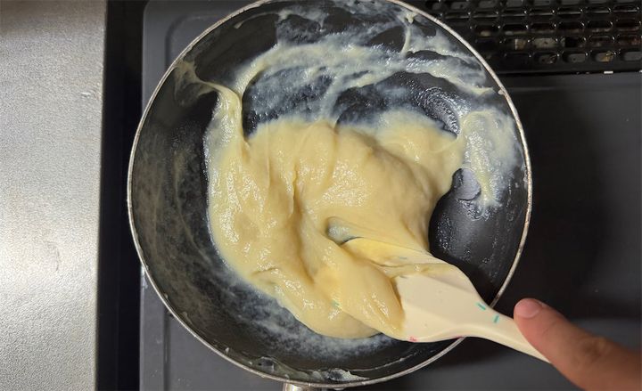 1.フライパンに[A]を入れて混ぜたら、弱めの中火にかけ、耐熱シリコンベラでたえず混ぜながら加熱する。