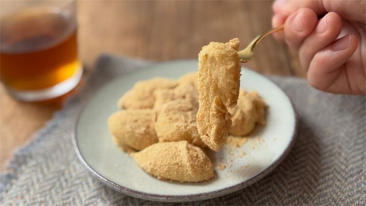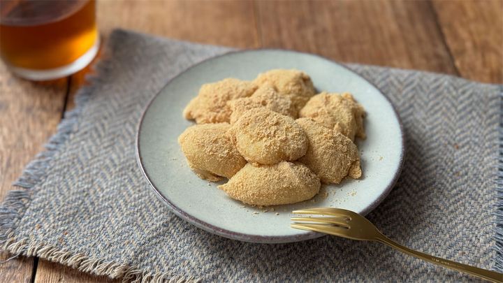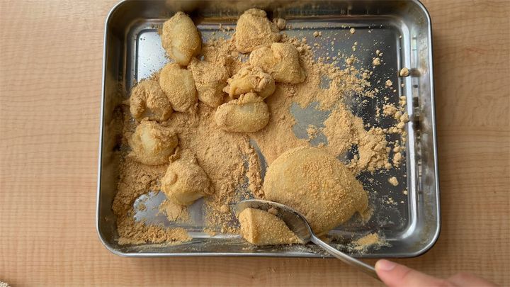 3.バットに広げたきな粉の上にのせ、上にもきな粉をかける。スプーンで一口大にちぎり、きな粉をまぶす。