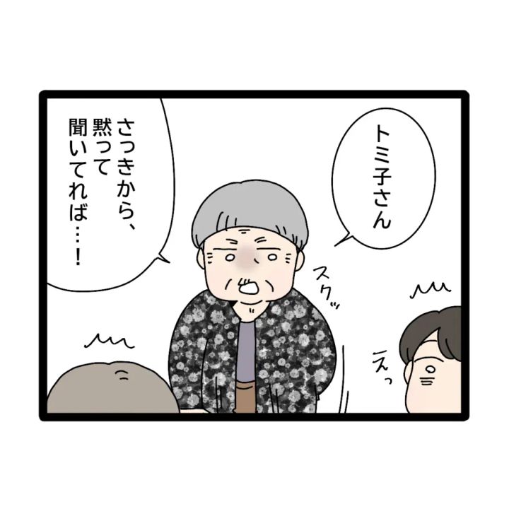 おばあちゃんが立ち上がって、「トミ子さん、さっきから黙って聞いてれば・・!」と言い、周りのみんなもびっくり!