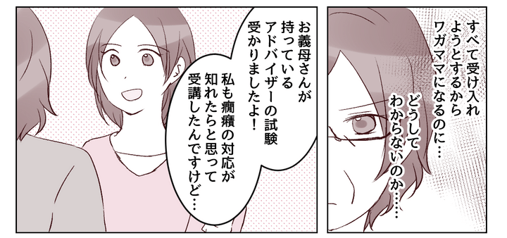 ヒビキやエミカさんとは、マユちゃんの癇癪への対応をめぐって言い合いになってしまいました。息子を立派に育てて、アドバイザーの資格もあるというのになぜ私を信用してくれないのか……。私はそんなふうに腹を立てていたのです。しかもエミカさんが同じ資格を取ったため、私は立場がなくなってしまいました。
