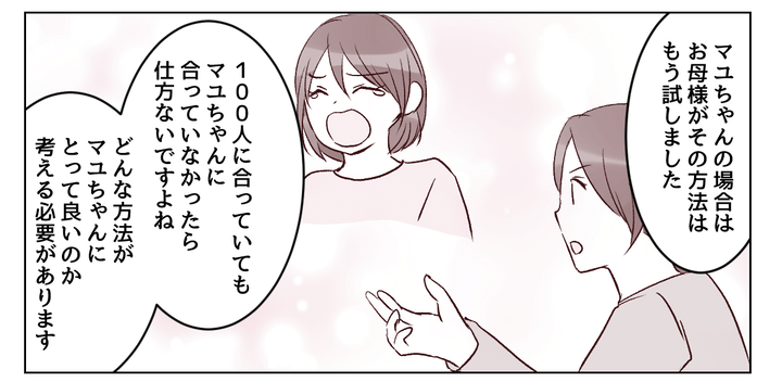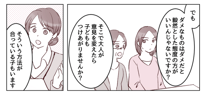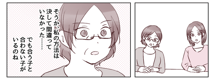 子育ての方法を「正しい」とか「間違っている」とかで考えてしまっていた私。自分のやり方が正解だと思っていたのです。けれど私の対応はマユちゃんには「合っていなかった」のです。きっとそれを私に伝えるために、エミカさんは私を誘ってくれたのでしょう。