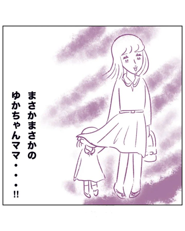 まるさんが児童館で出会ったゆかちゃんママは空気を読まず、話が通じないところもあり、自分のこだわりを周りに押しつけたりマウントを取ったりする人で、なぜかまるさんにとても執着してきました。ゆかちゃんママの度を超えた非常識な言動に我慢できなくなったまるさんが「友達にはなれない」ときっぱり言うと、ゆかちゃんママは「騙された!」とまるさんに怒りを向け、児童館の先生が止めに入るなど、先生やママ友も巻き込む騒動になってしまいました。この騒動の後、まるさんは急きょ夫の転勤が決まり、ゆかちゃんママに会うことなく県外へ引っ越すことになりました。ゆかちゃんママのことは記憶から消していたまるさんでしたが、引っ越しから一年後、仲良しだったマキちゃんママたちに会いに行ったまるさんの前に突然ゆかちゃんママが現れます。