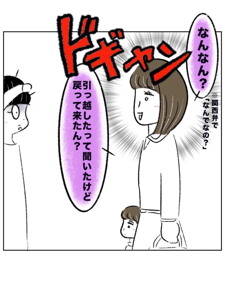 困惑して固まるまるさんに、ゆかちゃんママは「なんなん?引っ越したって聞いたけど戻って来たん?」と一方的に話しかけます。