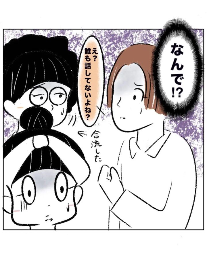ちょうど合流したたっくんママも含め、まるさん達3人は「なんで!?」と驚きます。「え?誰も話してないよね?」と小声でマキちゃんママが聞くと、たっくんママは困惑しながら無言で頷きます。まるさんは驚きのあまり固まっています。