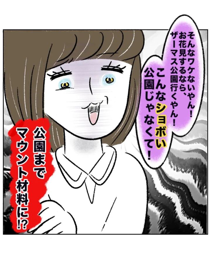 そして、腕を組みながら「そんなワケないやん!お花見するならザーマス公園行くやん!こんなショボい公園じゃなくて!」と馬鹿にしたように言いました。まるさんは「公園までマウント材料に!?」とドン引きです。