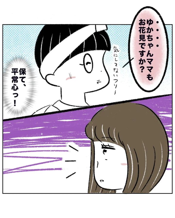 ゆかちゃんママの変化に困惑しつつも、気にしないフリをして「・・ゆかちゃんママもお花見ですか?」と必死に平常心を保ち話しかけたまるさん。