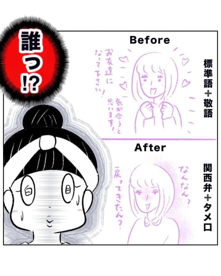 一年前は標準語で敬語だったゆかちゃんママがなぜか関西弁でため口の話し方になっていて、まるさんは「誰っ!?」と白目。