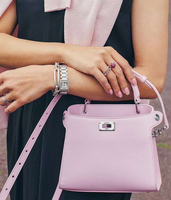 ツヤッな黒トップスにドラマティックなピンクスカートで甘ニッシュが完成。大胆なピンクもリネンなら柔らかな印象に。黒トップスでも顔映りが良く見えるよう、肌面積を増やし、重さを軽減し明るさをプラス。ハードなルックスのネックレスが持つ、上品で洗練された存在感で黒コーデを格上げ。