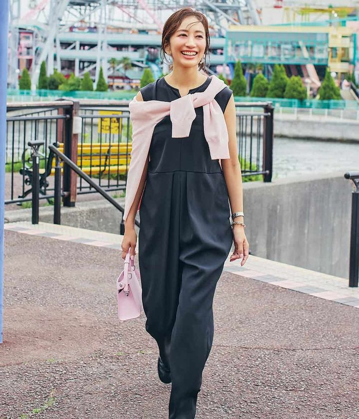 『子供たちと遊園地ではしゃぐときは動きやすさ×楽×オシャレを叶えるオールインワンが大活躍。推し色のピンクでテンションUP。』