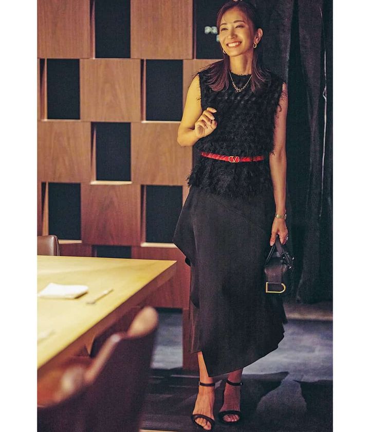 フェザー×レッドで艶やかに上品映え。オールブラックは異素材合わせで表情豊かに洗練感もUP。歩くと動きがでる女っぽスカートがお気に入り。ジュエリーは夜に華やかに映えるゴールド一択。