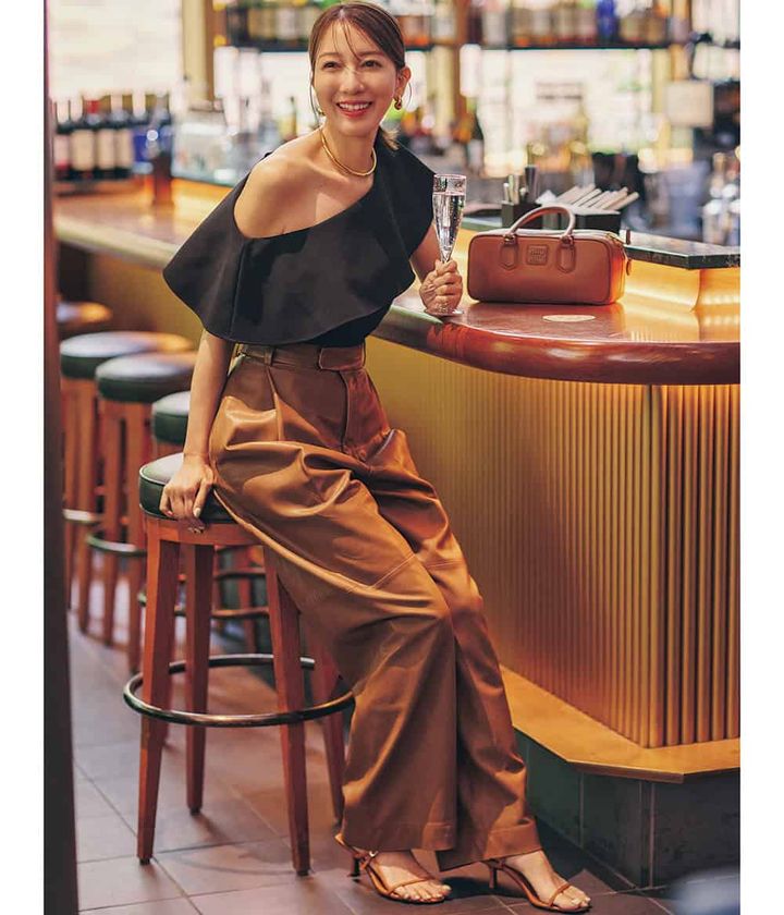 デコルテ出し×ブラウンで柔らかさを! 女子度高めなトップスには、ハンサムなブラウンのレザーパンツを馴染ませの調整役に。ジュエリーはゴールド、小物もキャメルで柔らかな印象に。