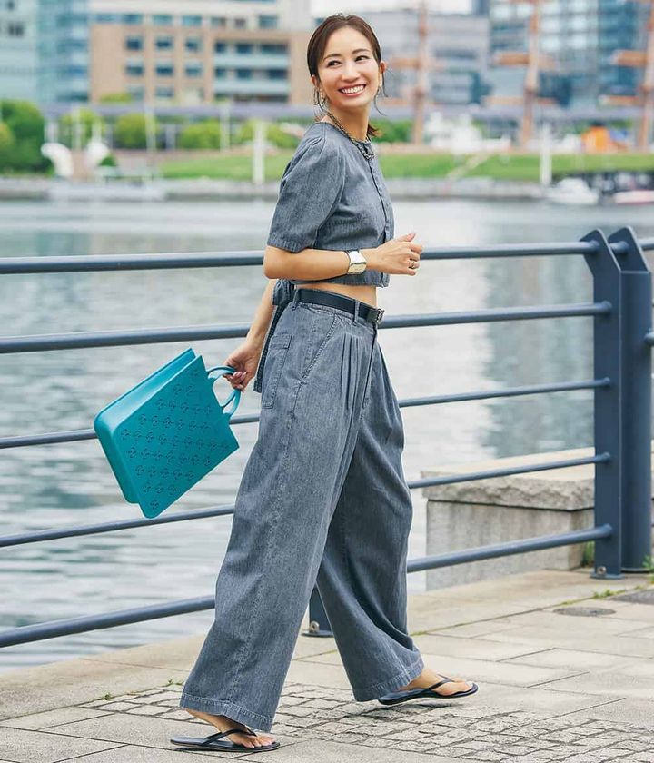 『撮影日はかしこまらず動きやすい軽快な印象のグレーデニムのセットアップが◎。 差し色のブルーでトレンド感をプラスしました。』