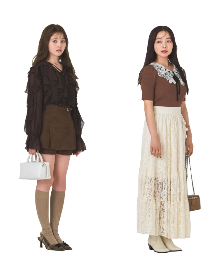 〈左・ナナ〉ブラウンフリルブラウス 18,700円/アプワイザー・リッシェ スエードスカパン 9,790円/dazzlin イヤリング 3,960円/マチルダローズ バッグ 8,800円/カカトゥ(アンビリオン)ハイソックス 1,540円/靴下屋(Tabio)チェック柄ミュール10,890円/RANDA〈右・紗英〉レースえりつきニット 8,800円/31 Sons de mode(ダブルエー)総レーススカート 9,790円/REDYAZEL ルミネエスト新宿店 ミニチェーンバッグ 2,990円/神戸レタス 時計 15,750円/アビステ ウエスタンブーツ 30,800円/ダイアナ(ダイアナ 銀座本店)