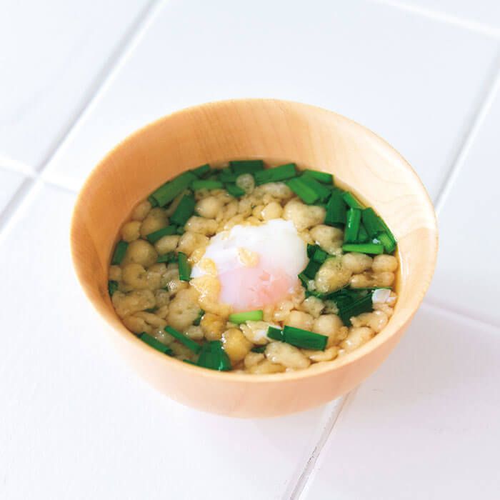 温泉卵を崩しながらいただくシンプルな中華スープ♡ 天かすでコクを加えて満足度が上昇!