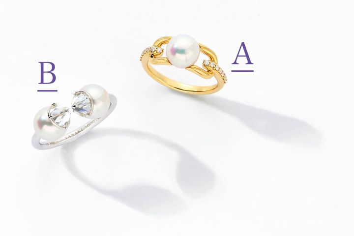 A.リング[K18YG×あこや真珠×DIA]¥456,500、B.リング[PT×あこや真珠×DIA]¥3,960,000/ともにTASAKI ワンピース¥165,000/ルネ