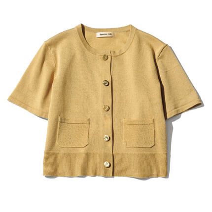 前を閉じても、インナーコーデをほんのりと感じられるのがシアーカーデの醍醐味。淡いトーンのクリームイエローで優しげに。