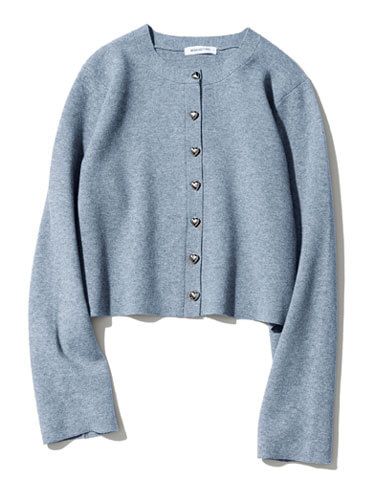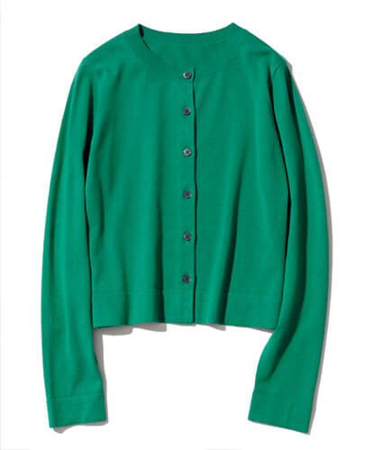 シャツなど、グッドガールな着こなしと相性抜群。プレーンなデザインで色みをフィーチャー。首元は開けて、襟をカーデの外側に出すと抜け感が♪