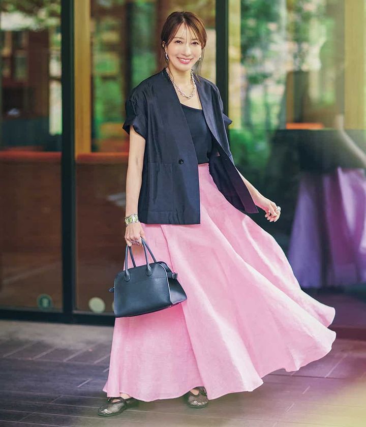ツヤッな黒トップスにドラマティックなピンクスカートで甘ニッシュが完成。大胆なピンクもリネンなら柔らかな印象に。黒トップスでも顔映りが良く見えるよう、肌面積を増やし、重さを軽減し明るさをプラス。ハードなルックスのネックレスが持つ、上品で洗練された存在感で黒コーデを格上げ。