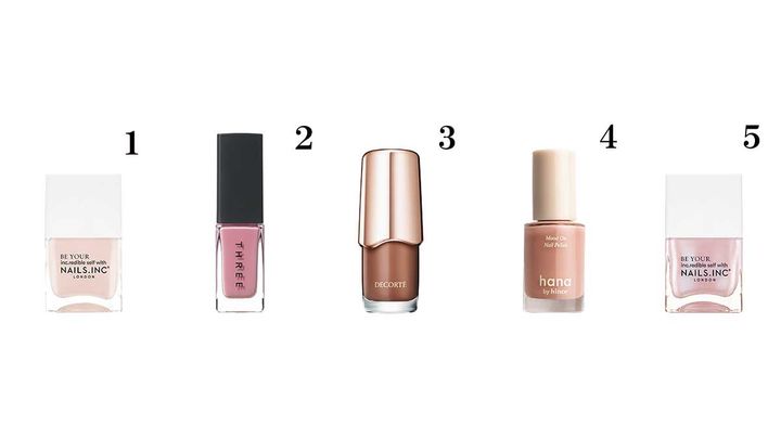 1.ネイルズインク オール アバウト ザ エステティック デュオ(ユア イン マイドリーム)、2.THREE ネイルラッカー 05 ¥2,420、3.コスメデコルテ スキニフィック ネイルラッカー 10 ¥3,300、 4.hana by hince ムードオンネイルポリッシュ 01 ¥680/hince、5.ネイルズインク オール アバウトザ エステティック デュオ(オールウェイズ プレッシングスヌーズ) ¥4,180(限定・とのセット)/TAT