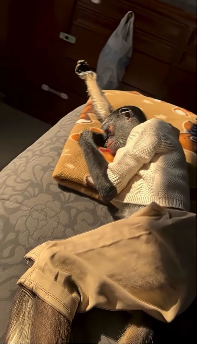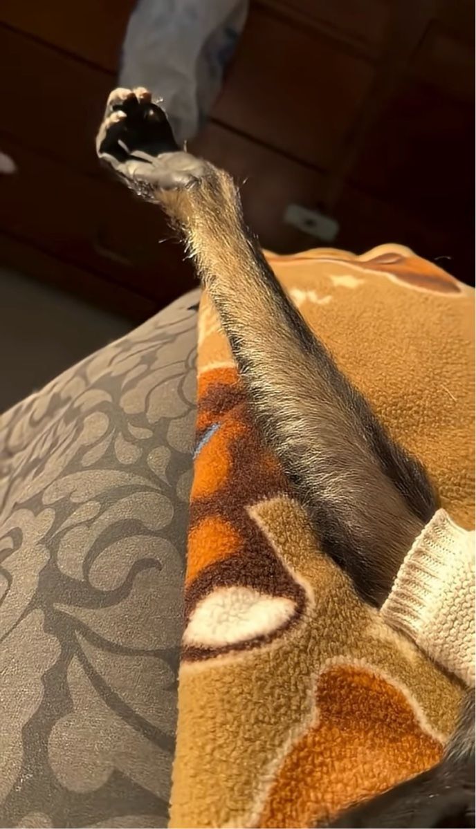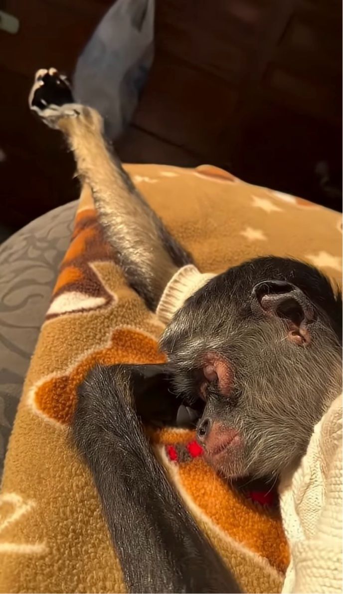 毛布からダラーンと伸びる細長い腕。 カメラがズームアウトしていくと、そこには熟睡している動物の姿がありました!