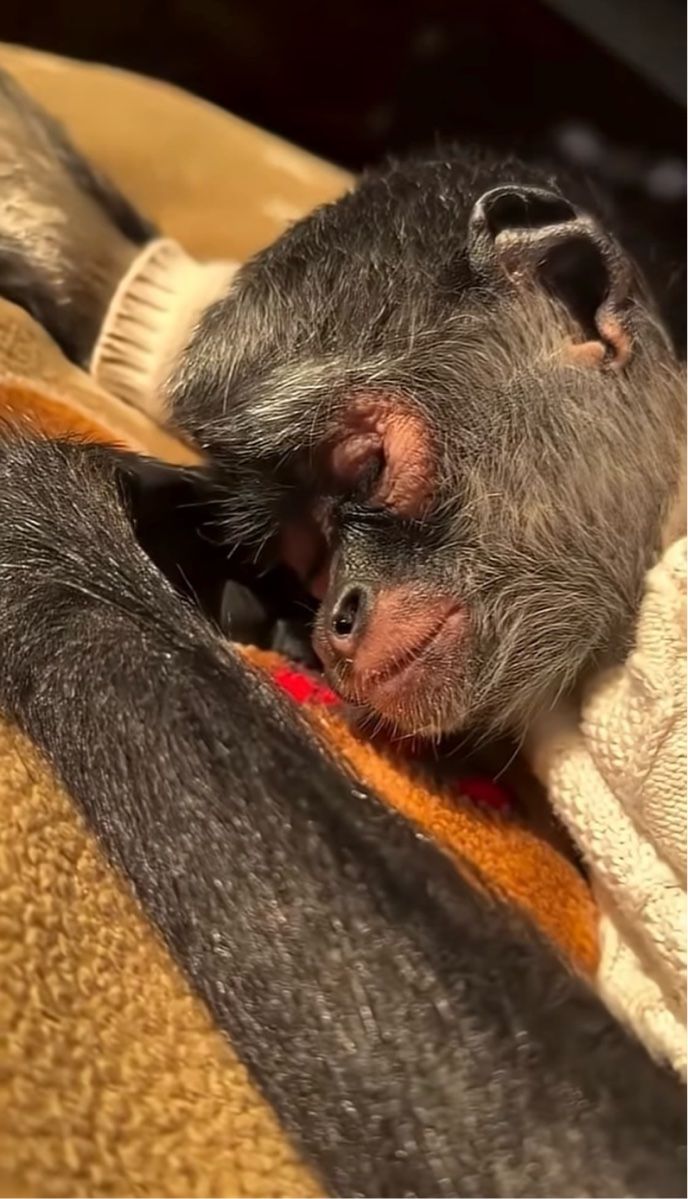 細くて長い腕をダラーンと伸ばして熟睡中のサル。 その寝姿は、こちらの動画からご覧いただけます。