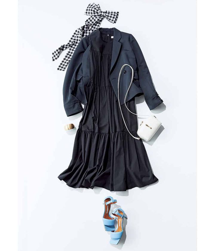 ジャケット¥49,000(ティーチ)ワンピース¥22,900(Ame no chi Hare)バッグ¥26,400(トフ&ロードストーン)サンダル¥36,300(ピッピシック/ベイジュ)リボンヘアフック¥6,600(ツル バイ マリコ オイカワ)バングル¥9,900(アビステ)