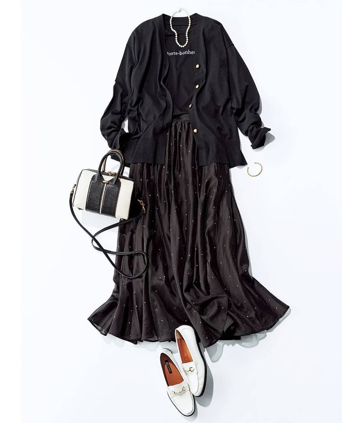 カーディガン¥7,700(エルーラ/アダストリア)Tシャツ¥2,980(アテニア)ハートドットスカート¥25,300(ジャスグリッティー/ジャスグリッティー プレスルーム)バッグ¥39,600(トフ&ロードストーン)ローファー¥29,700(ダイアナ/ダイアナ 銀座本店)パールネックレス¥22,050(アビステ)バングル¥14,520(チビ・ジュエルズ/ZUTTOHOLIC)