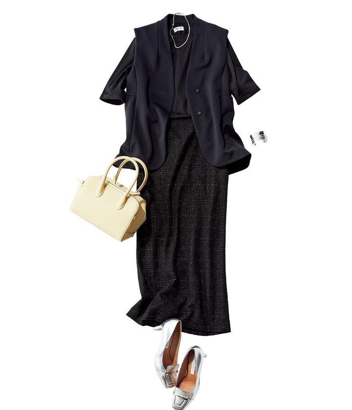 ジレ¥26,400(ルーニィ)Tシャツ¥5,500(マルゥ ユナイテッドアローズ/ユナイテッドアローズ カスタマーサービスデスク)スカート¥18,700(ノーク)バッグ¥53,900(ヴァジック/ヴァジックジャパン)パンプス¥24,970(タラントン by ダイアナ/ダイアナ 銀座本店)ネックレス¥21,600バングル¥7,830(ともにアビステ)