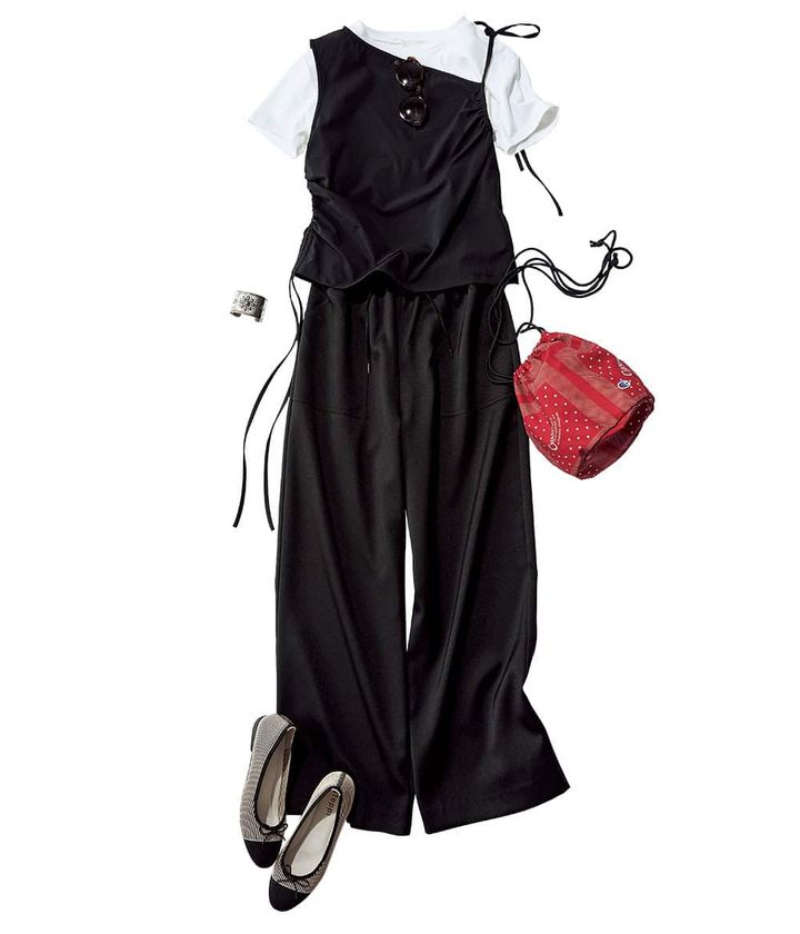 油やタレの跳ね対策には、汚れが落ちやすい防汚素材を。接触冷感のキャミなら、真夏のレイヤードも暑苦しくならない。パンツはサラッと生地&Ⅰシルエットでストレスフリー。防汚しつつ、キレイめもキープ。