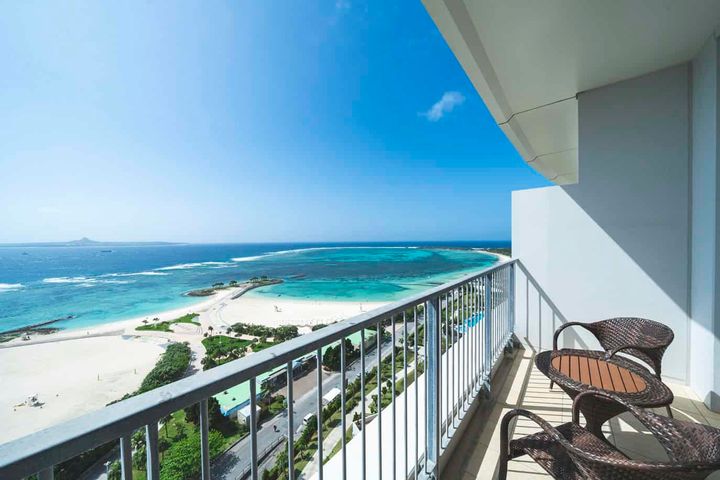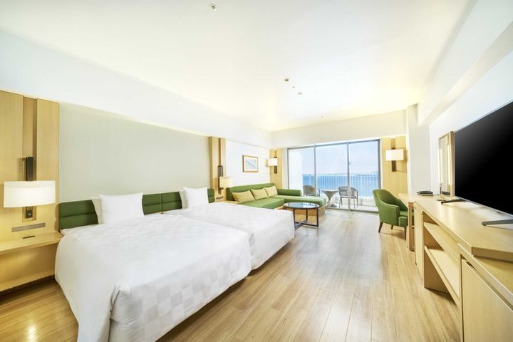 他に、素足で過ごせるベアフットルームやバリアフリールーム、壁一面に海の生き物たちが描かれた人気のキッズルーム、最上階にあるプレミアムツイン、スイートルームなどがあり、目的に合わせて様々なタイプの客室を選べます。室内はナチュラルかつ明るい空間で清潔感があり、とっても快適。サンセットタイムには伊江島の向こうに沈む美しい夕陽を眺めることができ、晴れた日はどの客室からも素晴らしい眺望です。