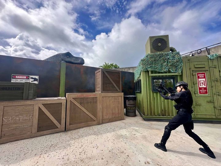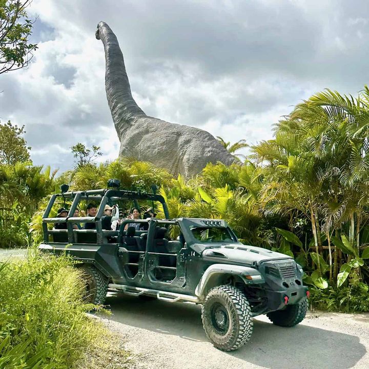 大型オフロード車に乗って恐竜の生息地へ向かう人気のアトラクション「ダイナソーサファリ」。急な坂や凸凹道、水の中を激しく走るため、吊革にしがみついていないと振り落とされそうなほど迫力満点です!