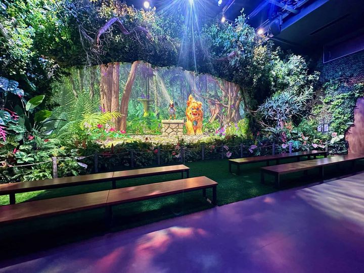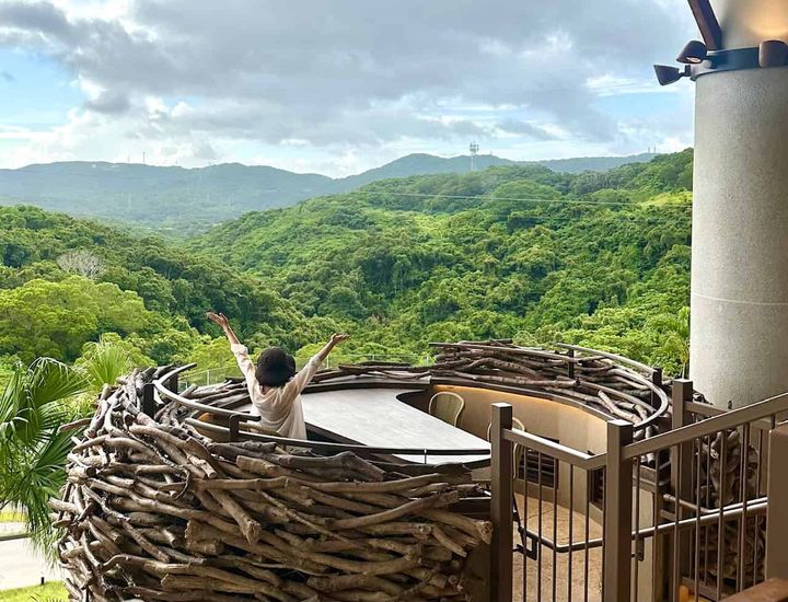 雄大なジャングルと青空の景色が広がる「パノラマダイニング」。鳥かごに見立てたオープンエアーのネスト席(有料)が印象的です。