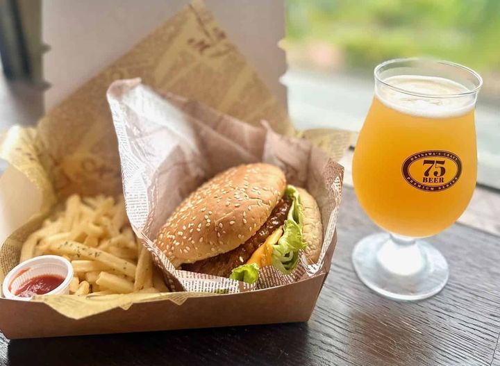 ハッピーパーク内にあるビアレストラン「やんばるの森」では、新鮮なオリオンビールを飲みながらハンバーガーなどの軽食をいただけます。