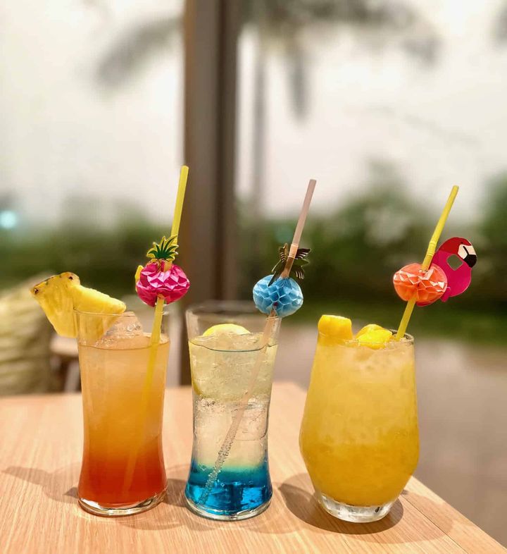 左:期間限定の今帰仁フルーツシャイニーサワー、右:ウエルカムドリンクビアバーのメニューには、ビール以外にオリジナルカクテルや石川酒造所のジンジャークラフトジン、泡盛、ノンアルコールカクテル、ソフトドリンクなどもラインナップ。