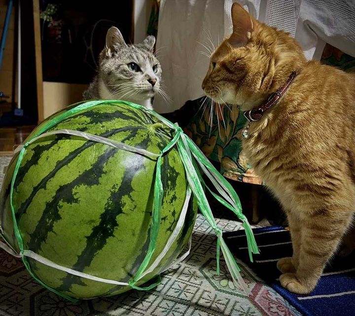左にいるのがサバトラの『シャケ』くん、右にいるのha茶トラの『ビワ』くんです。 確かに、スイカを前にして対峙しするその姿は、スイカが自分のものだと主張して揉めているような雰囲気がありますね~。