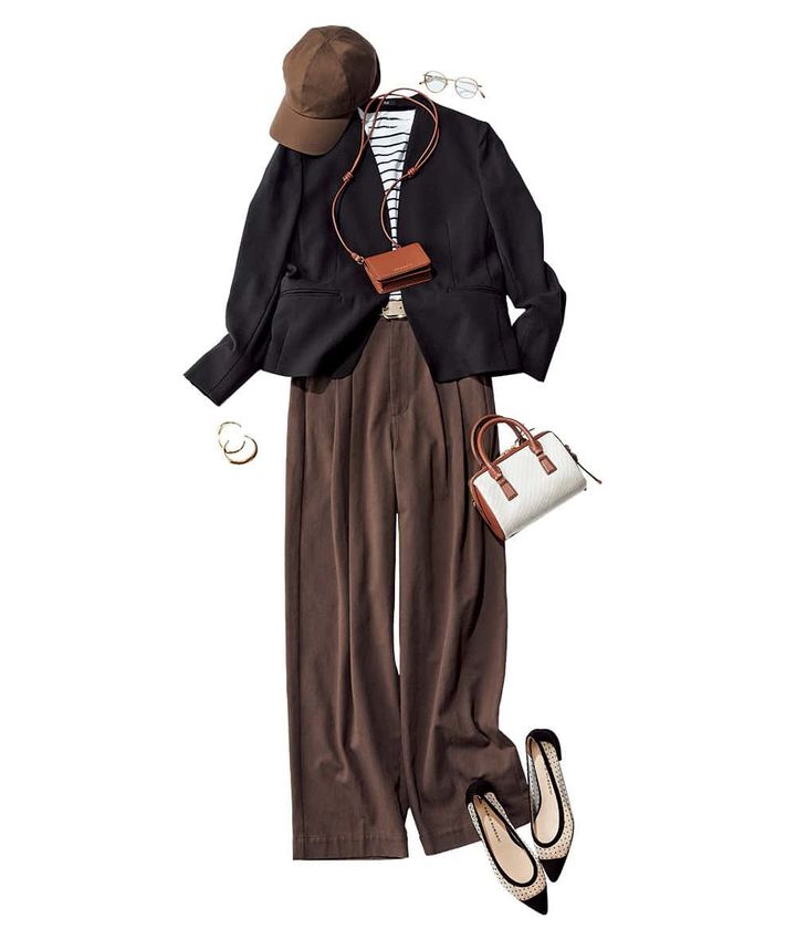ジャケット¥17,000(PLST)Tシャツ¥6,050(エルーラ/アダストリア)パンツ¥16,830(AKTE)ミニバッグ¥7,500ミニボストンバッグ¥13,900(ともにチャールズ&キース/チャールズ&キース ジャパン)パンプス¥34,100(ファビオ ルスコーニ/伊勢丹新宿本店 本館2階 婦人靴)ベルト¥9,900(アンタイトル)キャップ[UVカット]¥5,500(マルゥ ユナイテッドアローズ/ユナイテッドアローズ カスタマーサービスデスク)メガネ¥41,800(プロポ/プロポデザイン)バングル¥50,380(ソコ/ZUTTOHOLIC)