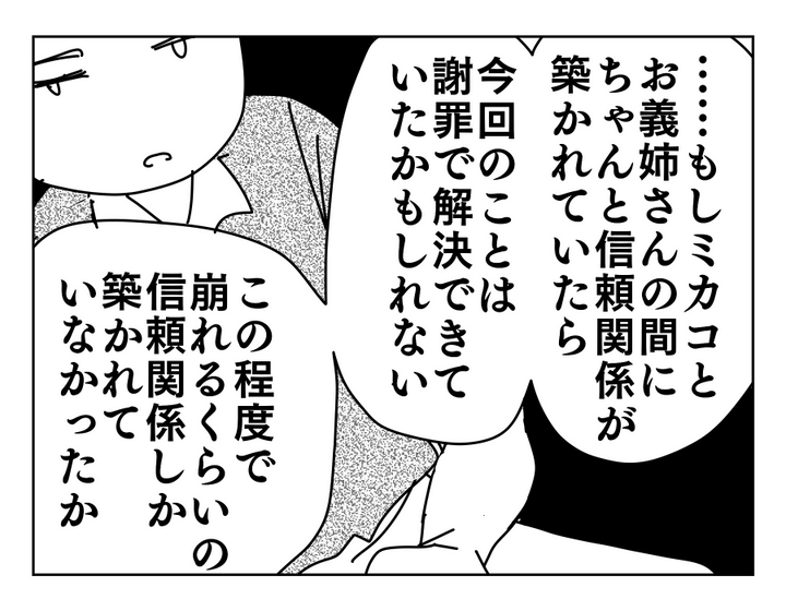 コウヘイさん、さらっとすごいことを言ってきますね。「片方だけが我慢している関係性って、我慢している方が手を放したら終わり」……はたしてこれは、今回のこと「だけ」を言っているのでしょうか? それともコウヘイさんとミカコさんの夫婦関係も含めて言っているのでしょうか。真相は闇の中ですが、ミカコさんも心を入れ替えないと、キョウカさんのようにコウヘイさんをも失ってしまうかもしれませんよ……? そしてミカコさんからの謝罪をキョウカさんが受け入れる日はくるのでしょうか……。