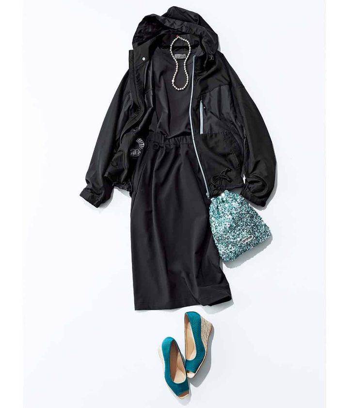 ウィンドコア耐久撥水シェルジャケット¥3,900ファン[別売り]¥5,800バッテリー[別売り]¥4,900(すべてワークマン)ノースリーブトップス[UVカット・接触冷感・マシンウォッシャブル]¥6,930(アンクレイヴ)スカート¥20,900(デサント オルテライン アイオー/デサントお客様相談室)バッグ¥6,996(アウトドアプロダクツ × フリークス ストア/フリークス ストア渋谷)パンプス¥13,200(ダイアナ ウェルフィット/ダイアナ 銀座本店)ネックレス¥58,080(ペヨテバード・デザイン/ZUTTOHOLIC)