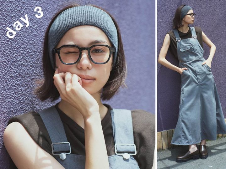 「時短にもなっちゃうよ」ヘアバンド¥6,930(ラカル)、ローファー¥33,000(パスクッチ/共にル タロン グリーズ ルミネ新宿店)、メガネ¥28,500(ウェイティング フォー ザ サン/リーンスプリング)
