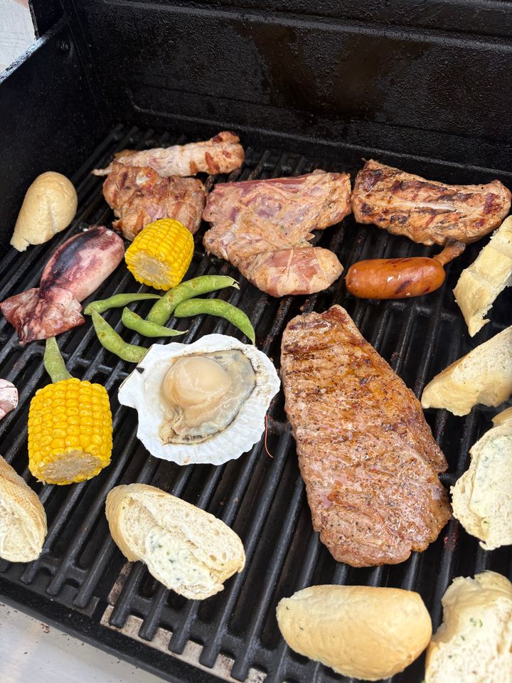 ボリューミーなお肉に加えて、シーフードやトウモロコシ、枝豆やガーリックパンもセットです🥖