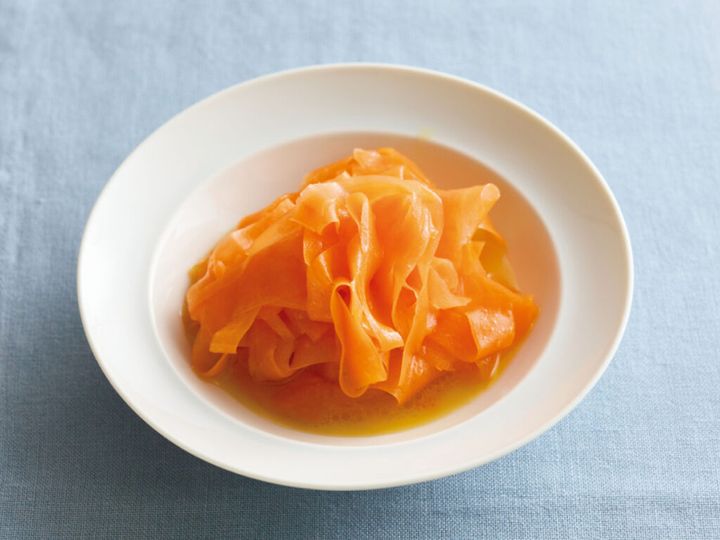にんじんをオレンジジュースに漬けるだけで、自然な甘みとさわやかさが楽しめるラペ風サラダに。ひらひらと彩りも鮮やかで、食卓がぱっと華やぎます。