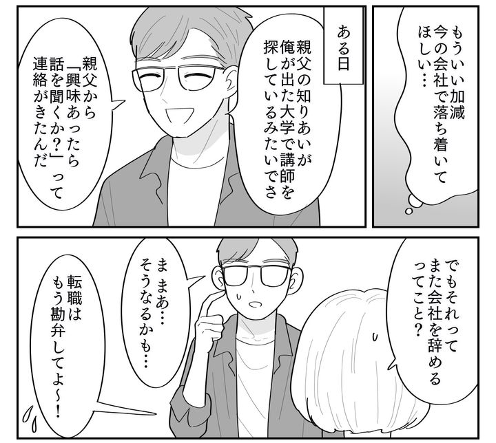 わが家は義実家のすぐ近所。夫は義父とときどき親子2人で飲みに行くほど仲が良いです。そんななか義父の知り合いから義父経由で、夫の母校で大学講師を探しているという話が舞い込んできたのでした。夫はすっかりその気です。