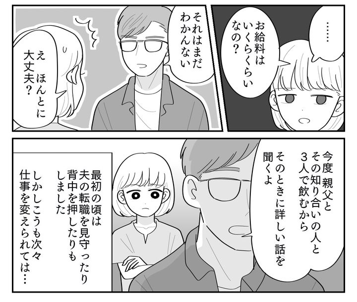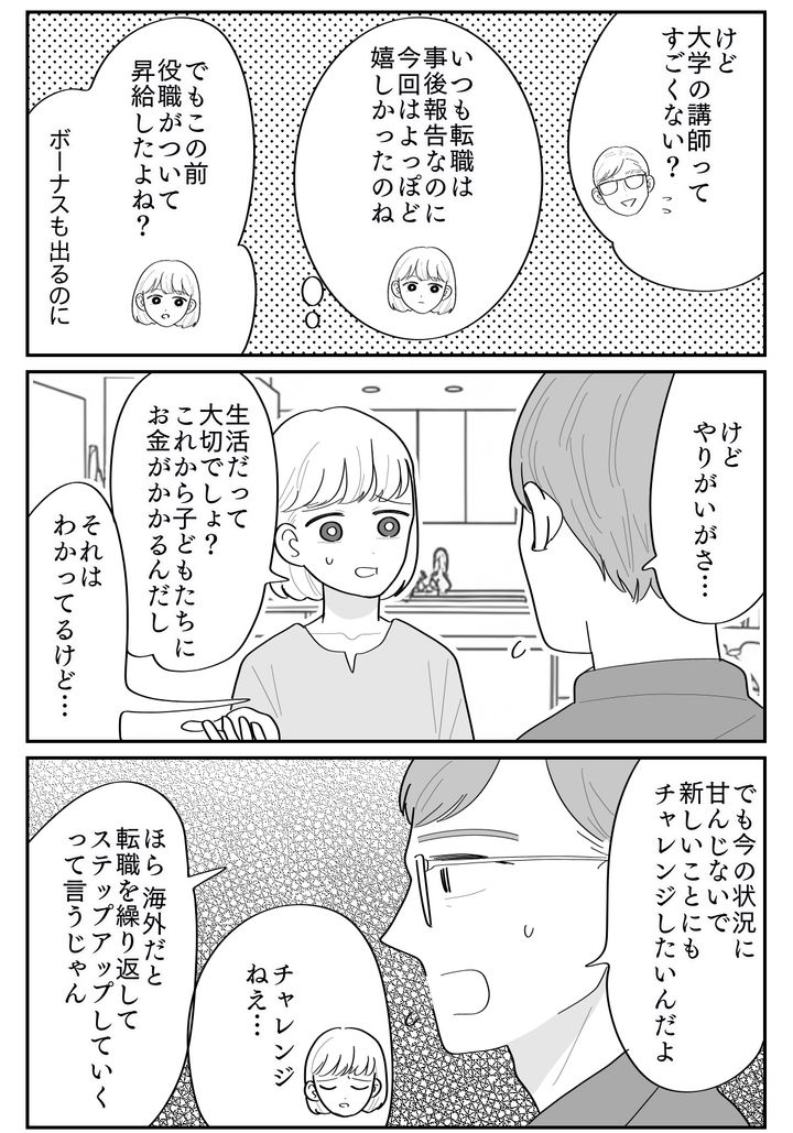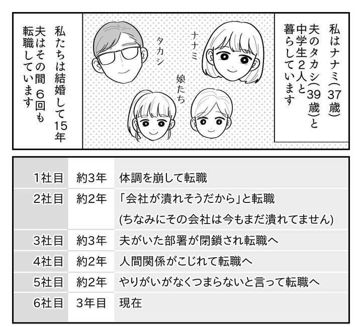 私(ナナミ)はパート勤務の主婦。会社員の夫(タカシ)と中学生の娘たちの4人で暮らしています。夫は地元では名の知れた工業大学を出て、ずっと技術系の営業職。けれどひとつの会社で長続きせず、2~3年経つとなにかしらの理由をつけて転職してしまいます。結婚してからの15年で、転職した回数は実に6回! 私が転職の話にあまり良い顔をしないため、夫はいつからか転職が決まってから事後報告するようになりました。そんなある日……。