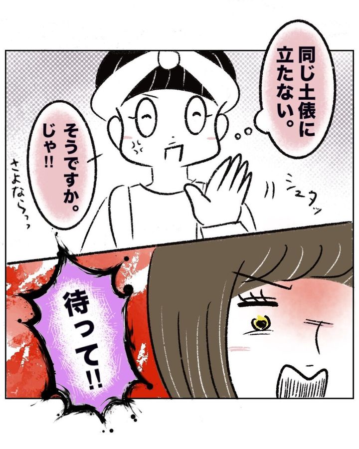 まるさんはイラっとしつつも「同じ土俵に立たない」と固く誓い、「そうですか。じゃ!!さよならっ」と引きつる笑顔で返し、その場を去ろうとしました。すると、ゆかちゃんママは血相を変えて「待って!!」と引き留めると、