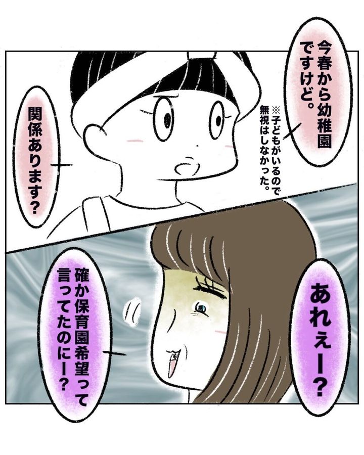 無視しようとも思いましたが、子どもの前で無視はできないと思い「今春から幼稚園ですけど。関係あります?」と素っ気なく答えたまるさん。すると、ゆかちゃんママは「あれぇー?確か保育園希望って言ってたのにー?」とニヤニヤ。