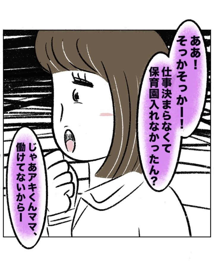 そして、まるさんが何も言っていないのに「あぁ!そっかそっかー!仕事決まらなくて保育園入れなかったん?」と勝手な解釈をすると、「じゃあアキくんママ、働けてないから・・」