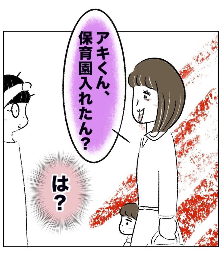 突然「アキくん、保育園入れたん?」と聞いてきたゆかちゃんママ。唐突な質問にまるさんは「は?」と目が点。