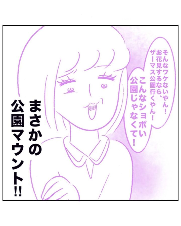 まるさんが児童館で出会ったゆかちゃんママは空気を読まず、話が通じないところもあり、自分のこだわりを周りに押しつけたり、やたらとマウントを取ってくる人で、なぜかまるさんにとても執着してきました。ある時、ゆかちゃんママの度を超えた非常識な言動に我慢できなくなったまるさんがきっぱり拒絶すると、ゆかちゃんママは泣きながらまるさんに怒りを向け、児童館の先生が止めに入るなど、先生やママ友も巻き込む騒動になってしまいました。その後、急きょ夫の転勤が決まったまるさんは、騒動以降ゆかちゃんママに会うことなく県外へ引っ越すことになり、ゆかちゃんママの記憶は封印して新生活をスタートさせました。しかし引っ越しから一年後、仲良しだったマキちゃんママたちに会いに行ったまるさんの前に突然ゆかちゃんママが現れます。みんながゆかちゃんママの登場に困惑する中、平然と笑顔でまるさんに話しかけてきたゆかちゃんママですが、以前は標準語で敬語だった話し方がなぜか関西弁でタメ口になっていてまるさんは唖然。しかし、気にしないふりをして「ゆかちゃんママもお花見ですか?」と話しかけると、ゆかちゃんママは「そんなワケないやん!お花見するならこんなショボい公園じゃなくてザーマス公園行くやん!」とよくわからないマウントを取ってきました。